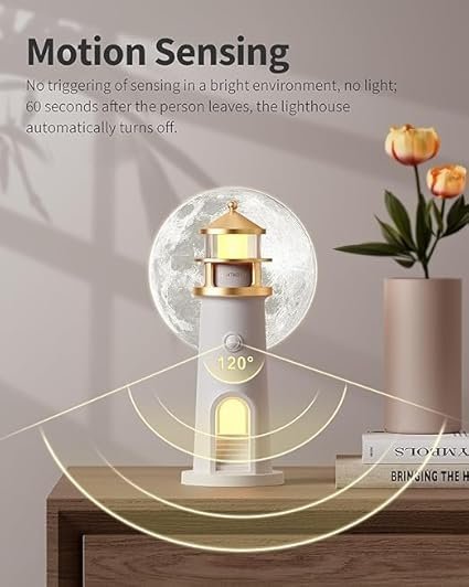 Moon Lamp, Lighthouse Night Lights with Full Moon Projector Cordless Motion Sensor Lighthouse Lamp Rechargable Battery Powered Lamps for Kids Boys Girls Gift Decor 9.6 inch