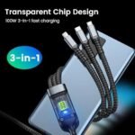 Ladli 3 in 1 USB Cable Fast Charging Transparent Luminous 100w Super Fast Charging Cable LED Indicator Nylon braiding Charging Solution for Type-C i/Phone Android Devices 480 Mbps Data Transfer